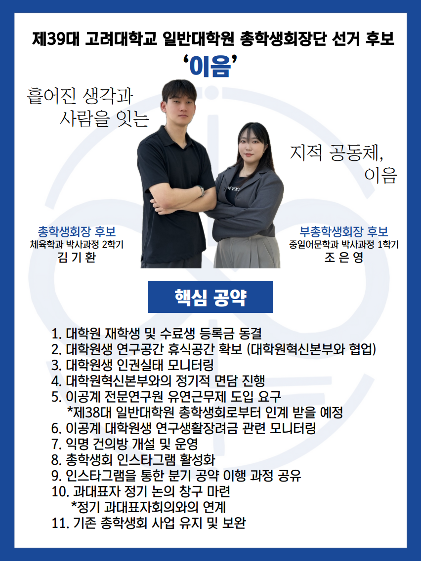 대학원생 개개인과 학문 간, 그리고 학생과 학교 사이의 소통을 의미하는 ‘이음’이 내세운 주요 공약은 ▲대학원 재학생 및 수료생 등록금 동결 ▲대학원생 연구공간 및 휴식공간 확보 ▲대학원생 인권실태 모니터링 ▲대학원혁신본부와의 정기적 면담 진행 ▲이공계 전문연구원 유연근무제 도입요구 ▲이공계 대학원생 연구생활장려금 관련 모니터링 ▲온라인 익명 건의방 개설 및 상시 운영 ▲총학생회 인스그램 활성화 ▲인스타그램을 통한 분기별 공약 이행 과정 공유 ▲과대표자 정기 논의 창구 마련 ▲기존 총학생회 사업 유지 및 보완이었다.