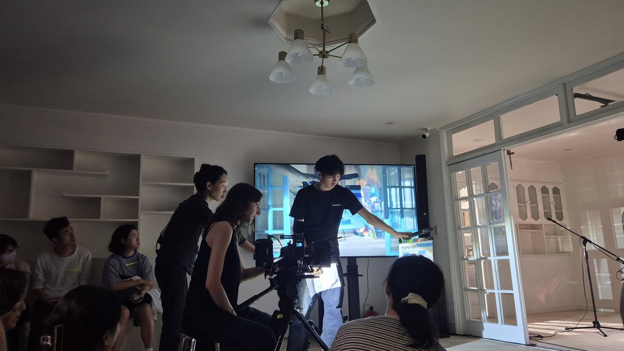 그리고 관객은 단지 지켜보는 이들인 것만은 아니다. 어떤 장면에서는 미리 자원한 관객이 카메라 앞에서 역할을 맡기도 하고, 그런데 이들의 연기란 앞에 놓인 대본을 읽는 것이다, 가면을 쓴다거나 자신의 옷 위에 화려한 천을 휘감은 ‘불청객’들이 촬영되는 프레임 안에 앉아 있기도 한다. 특정 역할이건 불청객이건 세세한 디렉션이 있는 것은 아닌 것이 리허설은 짧은 상황의 숙지로 이루어지고 촬영이 시작되고 대본을 읽어갈 때 역할을 두드러지게 드러내지 않는다. ‘불청객’은 카메라 프레임 안으로 들어와도 된다는 것, 즉 의도적 배치가 아닌 허용과 가면과 의상을 제외하면 주변에 앉아 있는 다른 관객들과 다를 바가 없다. 그도 그런 것이 퍼포먼스가 벌어진 LDK는 한남동 대사관로에 위치한 옛 대사관저를 문화공간으로 연 곳인데, 작은 마당과 방, 주방, 거실 등등 생활을 위한 집의 구조를 그대로 두고 있는 곳이다. 그러다 보니 따로 객석과 촬영을 위한 공간이 구분되지 않을 만큼 밀착되어 있다. 작은 거실에 카메라 앞을 제외하곤 스탭들이 가득 차 있는 현장 같다고 할까. 그런데 이들은 스탭이 아니고 관객이다. 그러다보니 때때로 촬영공간과 관객들의 공간이 엄격히 구분하기 어려운 경우들이 생긴다. 대형화면에 투사된 장면들을 보면 마치 카메라의 프레임으로 공간을 오려낸 것처럼 우리 눈앞의 현장을 완벽히 지운 장면이 있는가 하면, 배우의 이동을 따라가는 카메라에서는 어쩔 수 없이 좁은 공간에 옹기종기 앉아 있는 관객들이 프레임 안에 담겨 있기도 하다.